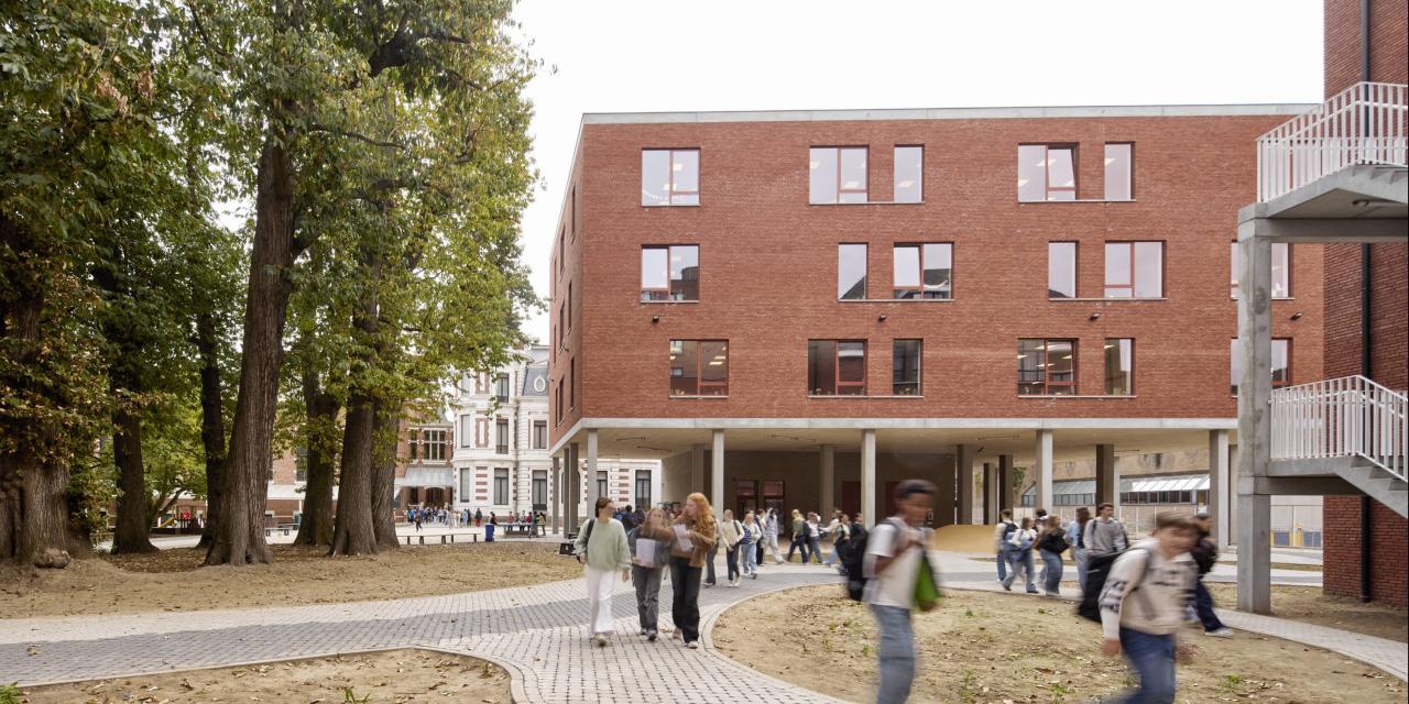De gevels van het hoekgebouw zijn opgenomen op de lijst van beschermd erfgoed. Achter de gevels wordt een nieuw gebouw opgericht met administratie en turnzaal op het gelijkvloers, een cluster met instructielokalen op de eerste verdieping en lokalen voor kunst & muzikale opvoeding op de bovenste verdieping.