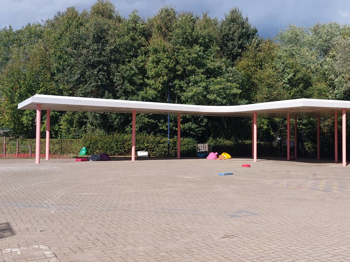 De werf van de nieuwbouw kleuterschool in Meise gaat snel vooruit. De luifel op de speelplaats is in gebruik genomen en de ruwbouw komt uit de grond.