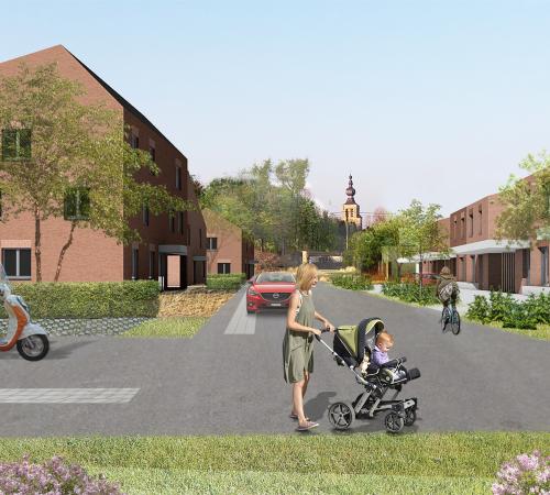 De nieuwe ontwikkeling is georganiseerd rond een binnenhof, geïnspireerd op de Begijnhoftypologie, met een specifieke vorm: de 4 gevels van het binnenhof lopen door in 4 doorsteken naar de omliggende straten. Het binnenplein zorgt voor de gewenste geborgenheid en centraliteit voor de lokale gemeenschap (ontmoetingsplaats, rustplek, speelterrein) en is bewust autovrij gehouden. De meeste woningen worden ook ontsloten vanaf het binnenplein dat zo eveneens fungeert als ‘inkomhal’ van het project. Verder is er een fietsenstalling en een toegang naar de ondergrondse parking op het plein.
